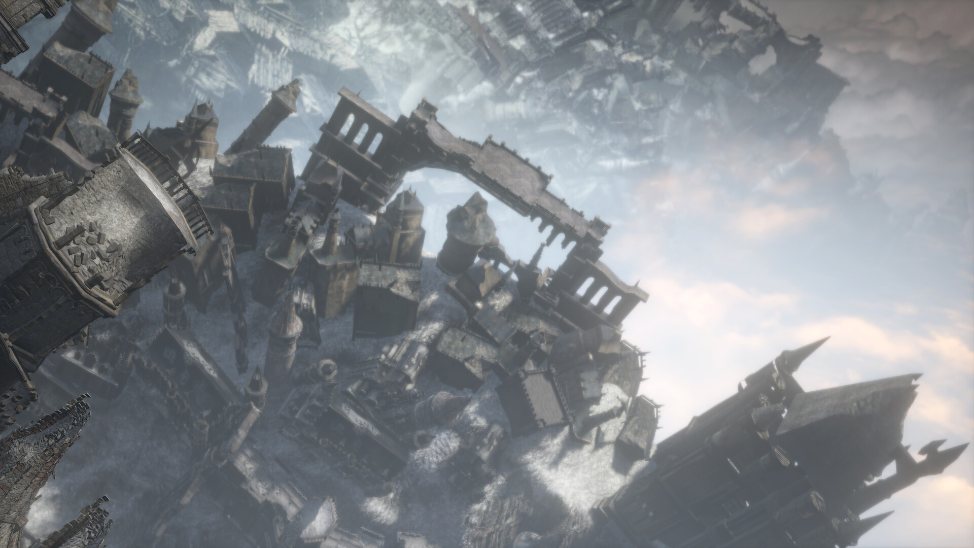 In this game, the world is tired and coming apart. Space and time become confused and incoherent. Places that are familiar to the player are revisited in ways that do not make narrative sense and show up interconnected in unexpected and physically impossible ways. The gameplay is designed to be punishing to mistakes. Between brief oases of safety, the player traverses hostile gauntlets, expecting to die repeatedly and to lose scarce resources each time. The story of the game is opaque and oblique, and without prior knowledge the player will know almost nothing about who they are, how the world came to be the way it is, where to go, or why they are doing anything at all. The game uses its cartography and level design to communicate its vision of a world which is losing meaning and purpose. The last area of the game, the Dreg Heap, is a striking visual metaphor for a collapsing narrative of place – every previous location is piled into a physically impossible and meaningless amalgam.